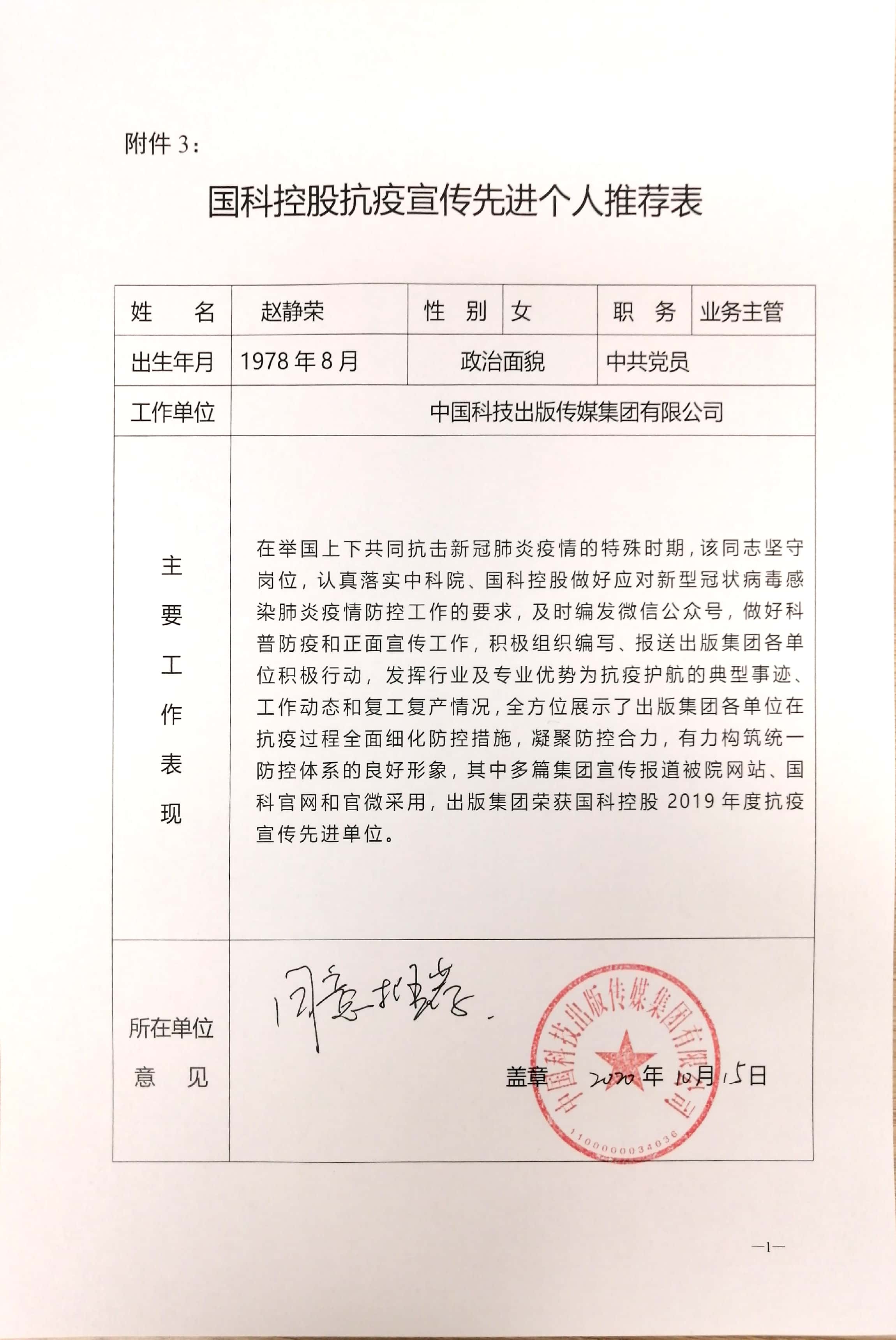 根據《中國科學院控股有限公司 關于推薦國科控股2019年度信息宣傳先進個人和抗疫宣傳先進個人的通知》,經出版集團研究決定,擬推薦趙靜榮同志申報抗疫宣傳先進個人。現將其相關材料進行公示,如有異議,請在公示期間向集團辦公室反映。